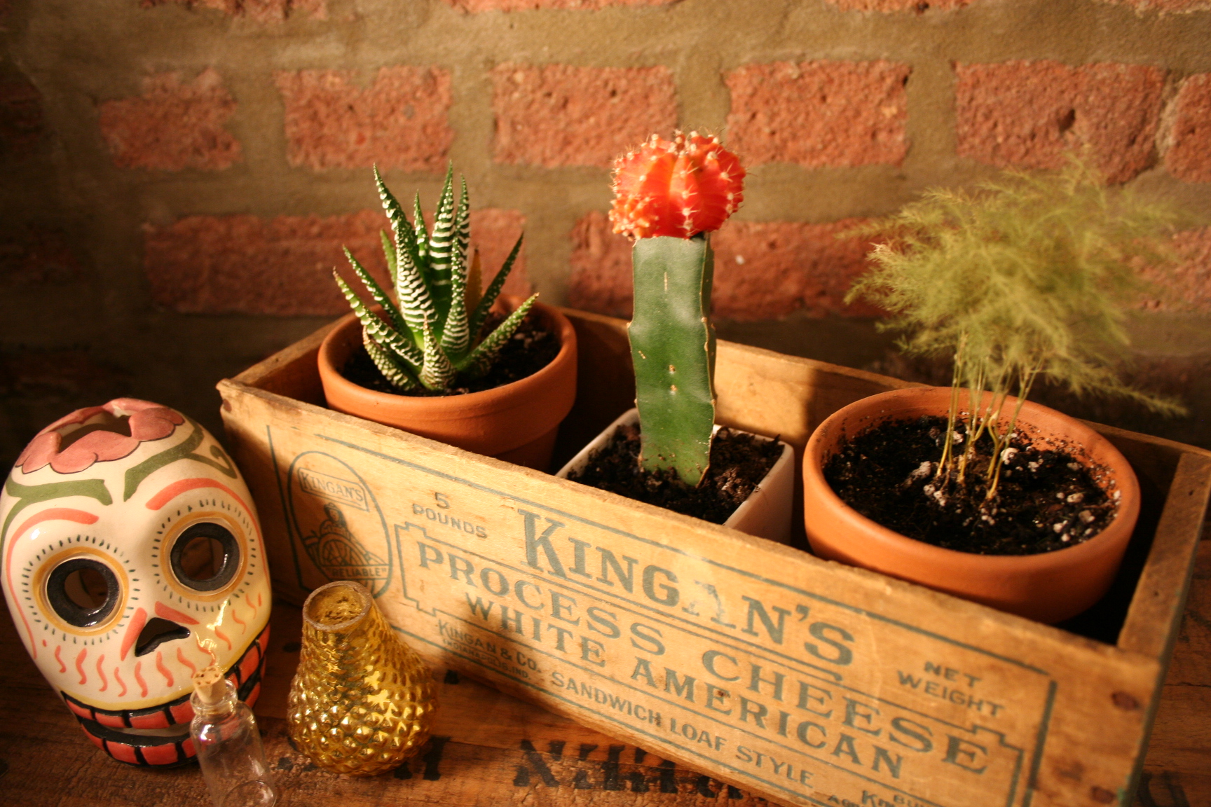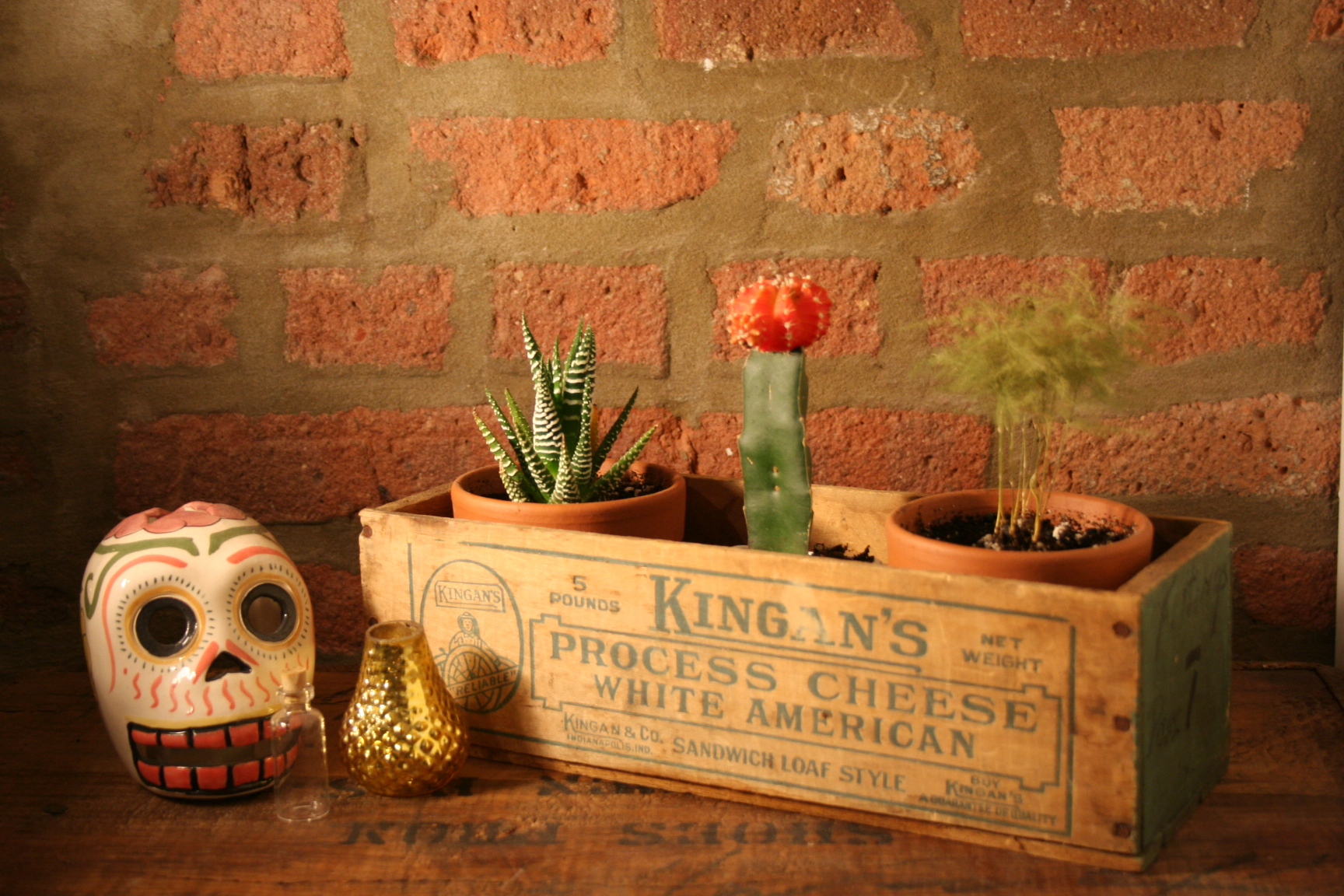 This vintage cheese box mixed with three unique plants (variety of succulents and cacti) are an excellent addition to any shelf in any room!