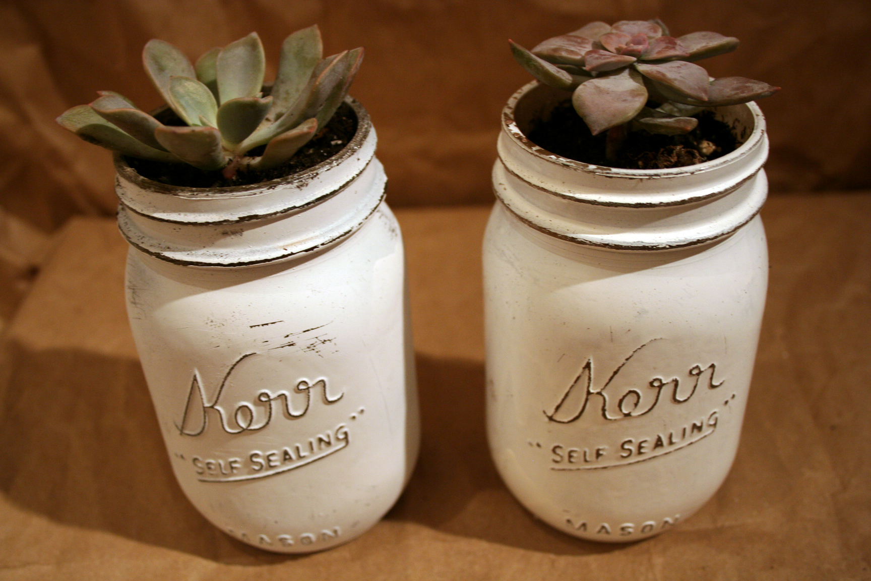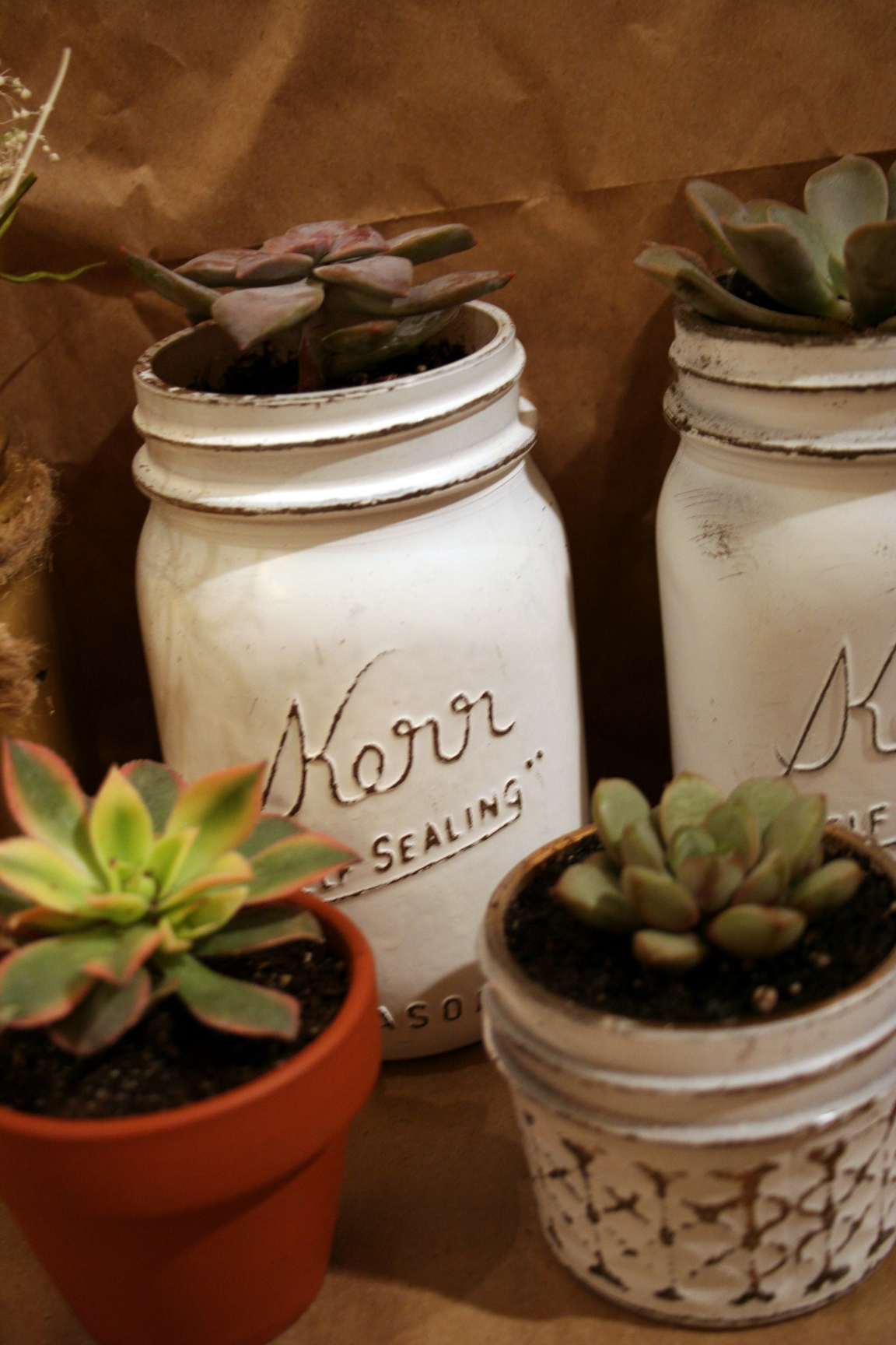 Vintage Style Matte White Mason Jar and Succulent